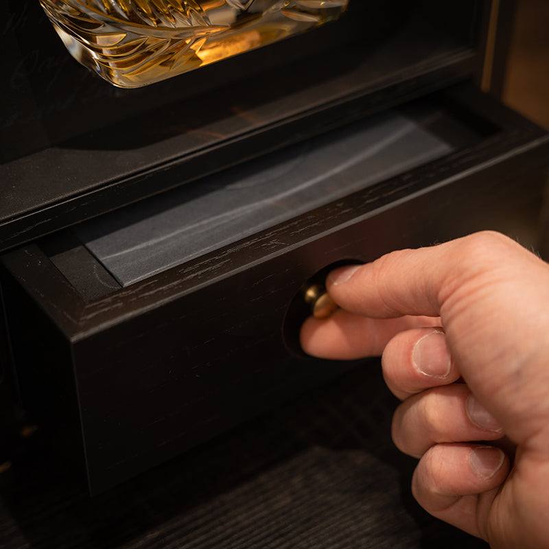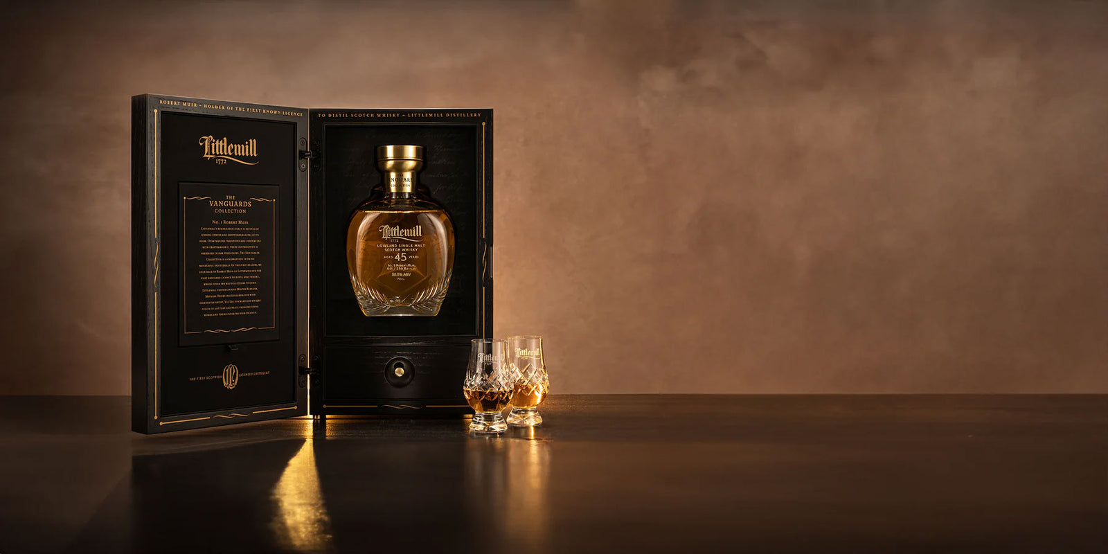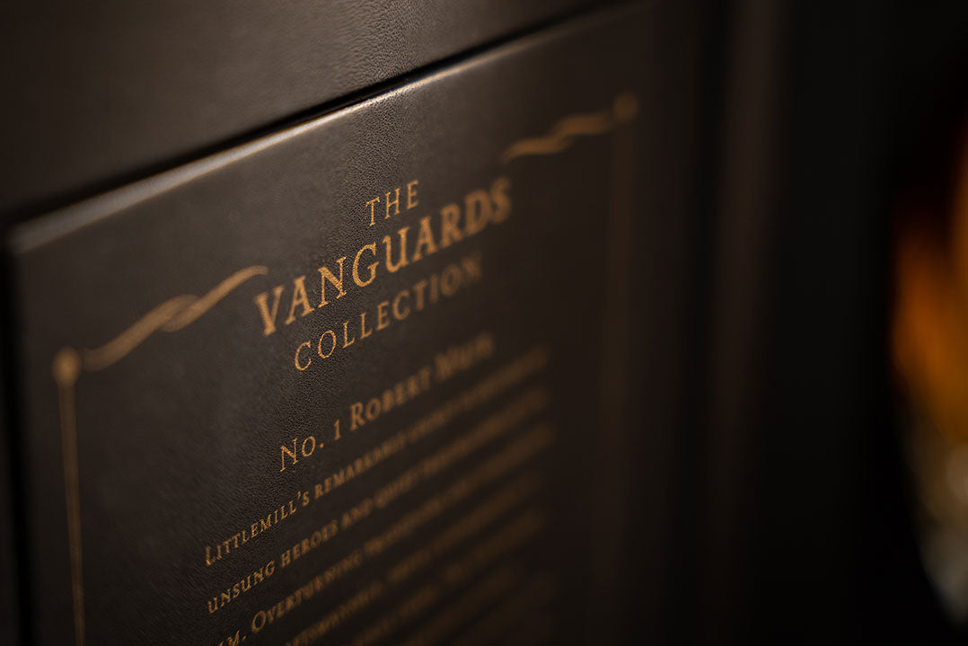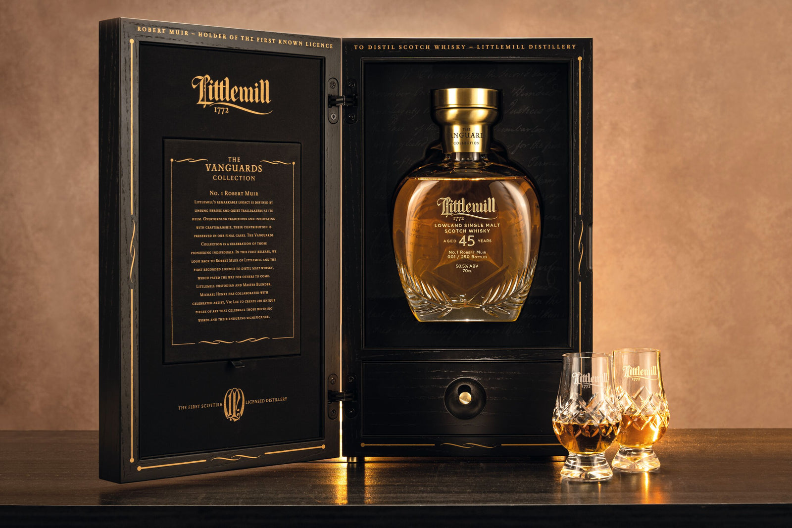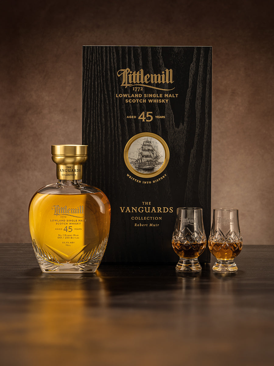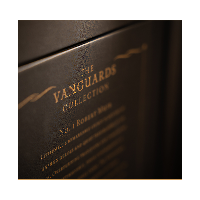 The Vanguards Collection No.1 is presented in a handmade ash display cabinet, crafted by Littlemill’s most trusted carpenters and woodworkers. A glass portal in the cabinet door provides a window through time to the individually numbered artworks created by Vic Lee, which can be removed and displayed. 250 bespoke and handblown Glencairn crystal decanters have been individually numbered to hold this remarkable 45-year-old single malt whisky. The delicate cuts in the decanter take their inspiration from traditional writing quills of the time used to mark Robert Muir’s name and licence into history. Housed alongside each decanter and the artwork is a branded 50ml miniature a hardback book covering this incredibly special liquid and its history.