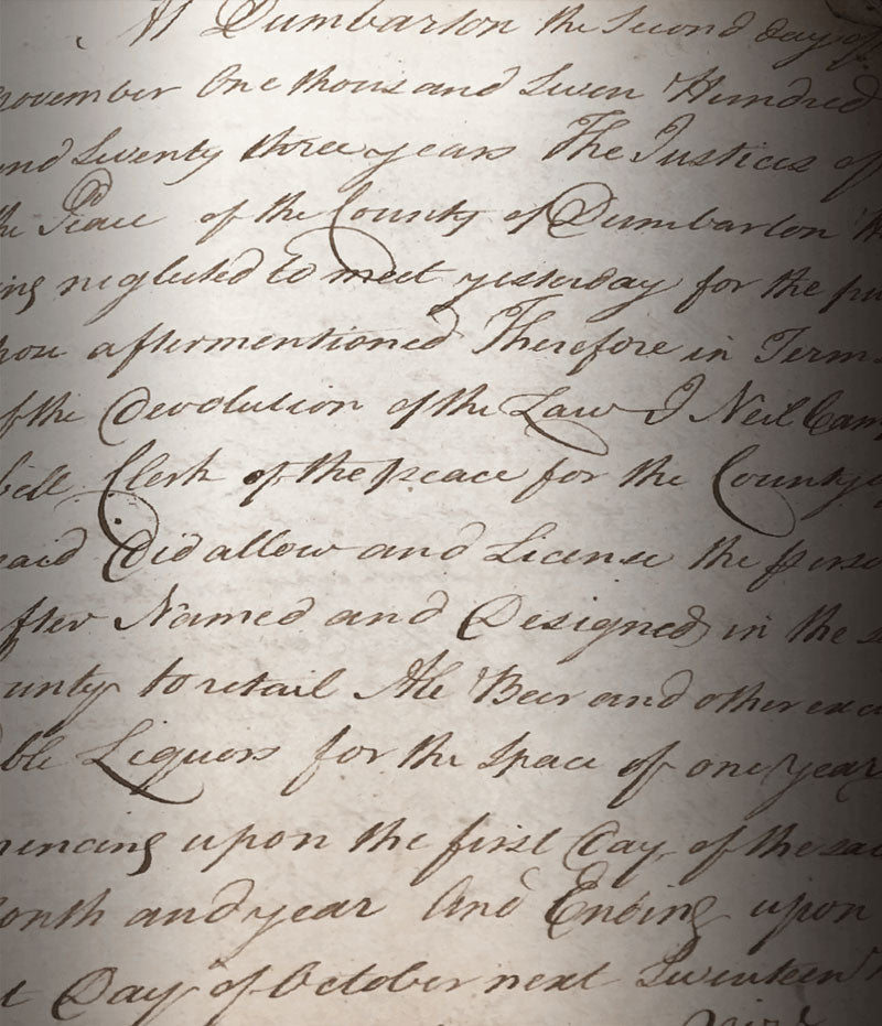 After one year, on the 2nd of November 1773, local Justice of the Peace records for Dumbarton show that ‘Robert Muir of Littlemiln’, an employee, was granted the first ever licence by the Government of King George the 3rd to “…retail ale, beer and other excisable Liquors.”