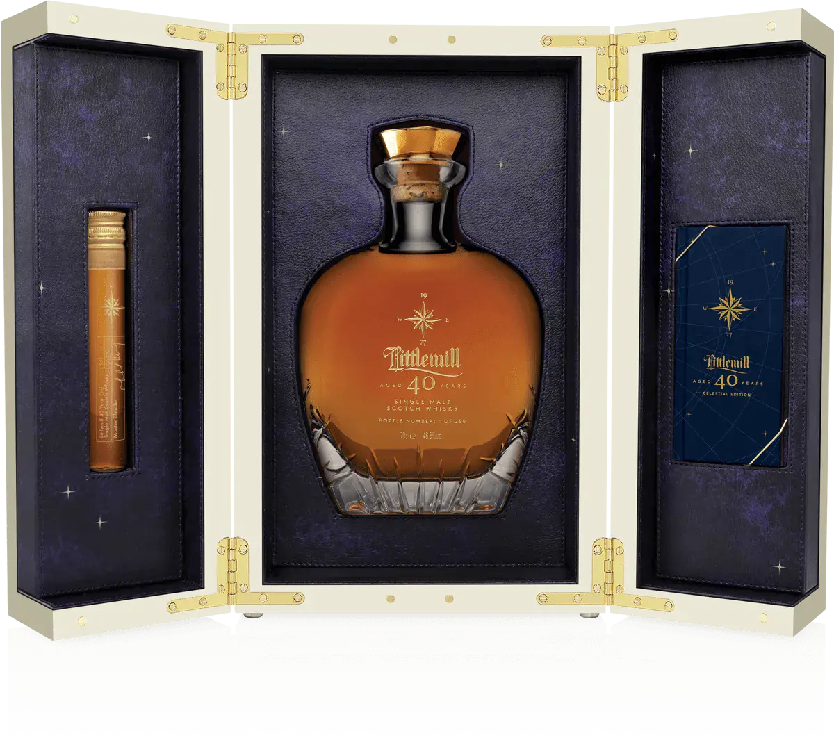 Each Littlemill 40 year old Celestial Edition decanter is made from the finest hand blown Glencairn Crystal, before being hand cut and finally individually engraved with its unique bottle number. The solid brass stopper is made in Glasgow and has a premium ‘fleur’ grade cork to ensure that the precious liquid remains secure within the decanter.